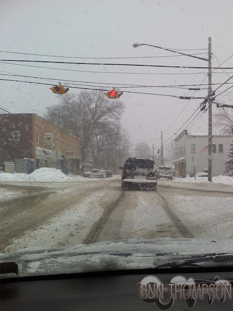 Last week we were experiencing what was called a lake effect storm. What that boils down to is there's going to be a ton of snow. As much as I wish I could stay inside and just watch said storm through the window, I must venture out. This is what it looked like on one trip